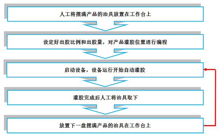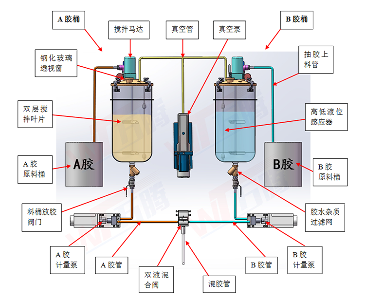 1.基本功能: 自動(dòng)灌膠機(jī)的作用主要是將AB兩組膠水按照設(shè)定好的比例和出膠量,自動(dòng)配比好后自動(dòng)混合均勻,再灌到產(chǎn)品里面。 1)按需配比-精確混合 雙組份AB膠按比例精確計(jì)量攪拌混合,灌膠多少則瞬間混合多少,最大限度節(jié)省膠水。 2)持續(xù)供料-AB膠獨(dú)立供膠 實(shí)現(xiàn)膠水持續(xù)自動(dòng)供膠,配備兩個(gè)30L不銹鋼儲(chǔ)料桶,兩組計(jì)量泵,AB膠分別獨(dú)立儲(chǔ)放和供膠,可以實(shí)現(xiàn)膠水的加熱,真空脫泡,料桶攪拌等功能。 3)定量灌膠-友好的人機(jī)對(duì)話(huà)界面 精確自動(dòng)定量灌膠,人性化操作界面,可設(shè)定灌膠次數(shù)、灌膠量、灌膠間隔時(shí)間等。操作簡(jiǎn)易方便。 2.供膠原理圖:
