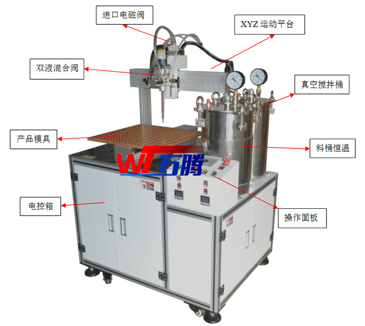 1. 外框機(jī)箱機(jī)架。 2. 30升不銹鋼A膠料桶(工作容積約15-20升)。 3. 30升不銹鋼B膠料桶(工作容積約15-20升)。 4. 4升不銹鋼C清洗料桶。 5. AB膠桶調(diào)速馬達(dá)和攪拌器。 6. AB膠桶液位傳感器。 7. AB膠壓力傳感器。 8. AB膠桶外部加熱裝置和AB膠管加熱裝置。 9. AB膠管3米。 10. 適用環(huán)氧A膠的螺桿計(jì)量泵。 11. 適用環(huán)氧B膠的齒輪計(jì)量泵。 12. 旋片式靜音真空泵。 13. 油水分離器。 14. 靜態(tài)混膠裝置。 15. 人機(jī)界面觸摸屏。 16. 專(zhuān)用控制系統(tǒng)。 17. 報(bào)警信號(hào)指示燈。 18. 急停按鈕。 19. XYZ模組滑臺(tái)。 20. 產(chǎn)品定位治具。 |